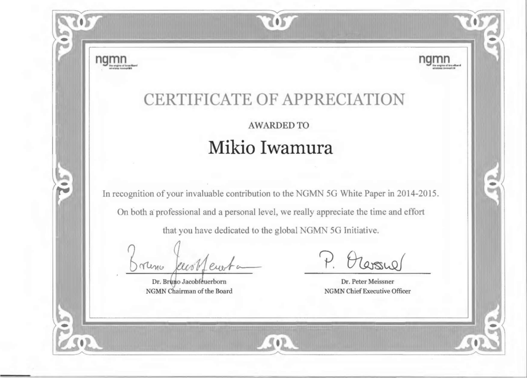 One of our employees, Dr. Mikio Iwamura, received a Certificate of Appreciation from NGMN in recognition of his invaluable contributions and dedication to the global NGMN 5G Initiative.