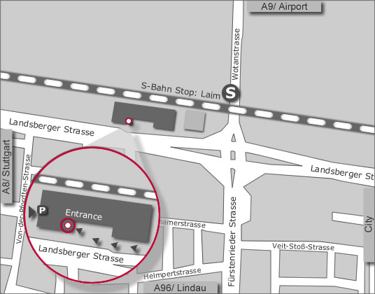 Take exit to Schwabing and direction freeway to Lindau (A96). After crossing the railway tracks at Donnersberger Brücke take direction Augsburg until Laim